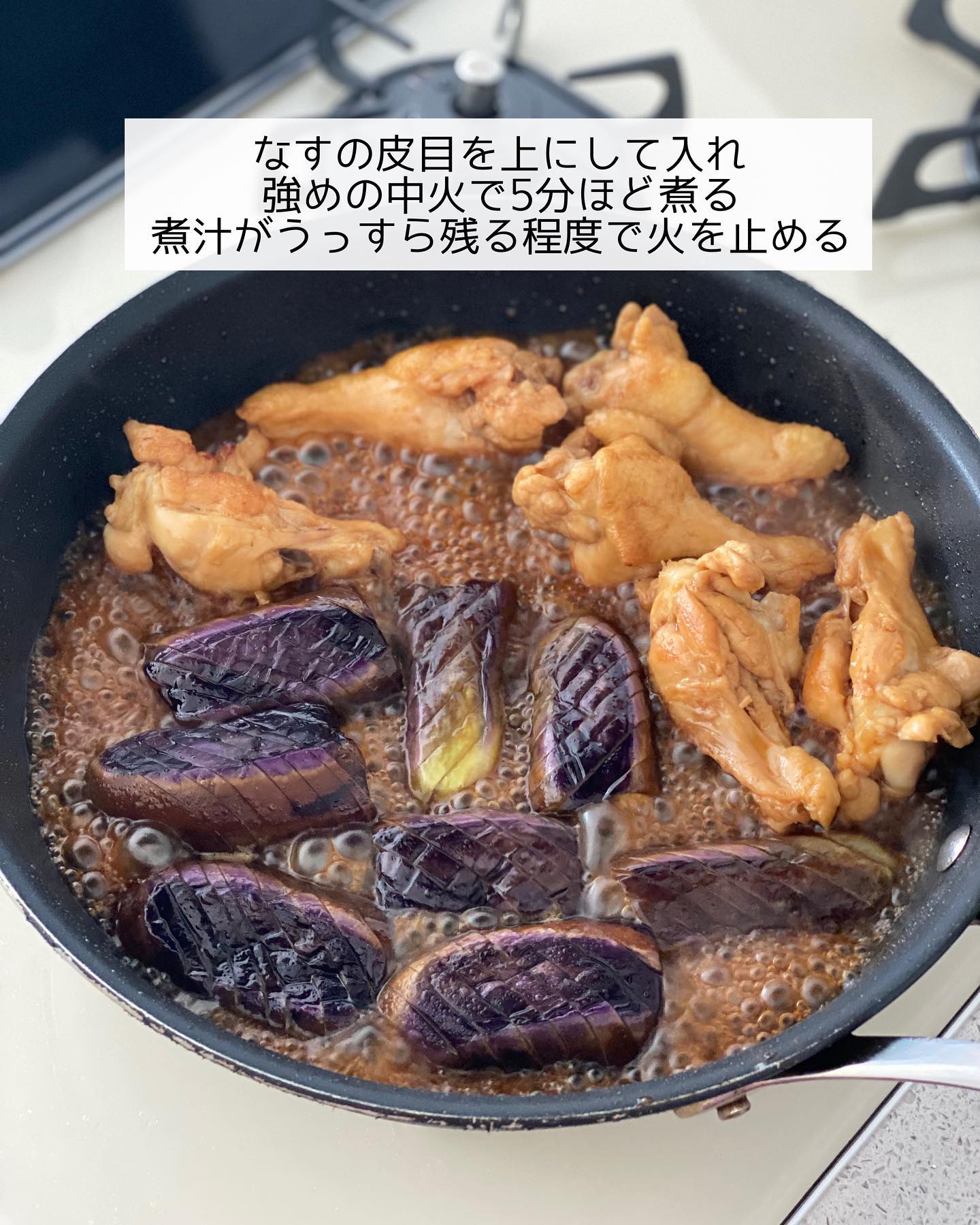 ➍落とし蓋を取り、なすの皮目を上にして入れる。強めの中火にし、𝟻分ほど煮る。煮汁がうっすら残る程度で火を止める。