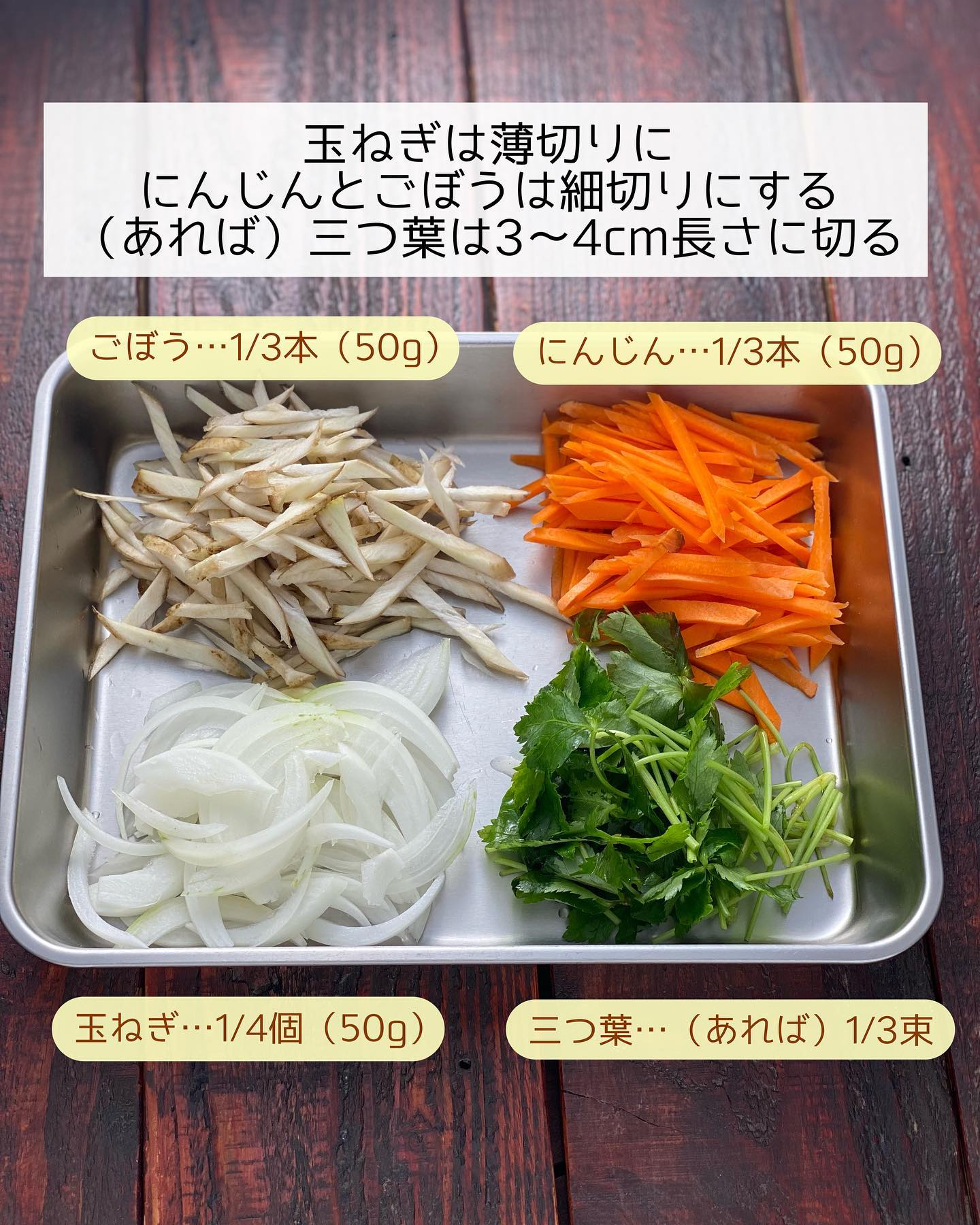 ➊玉ねぎは薄切りに、にんじんとごぼうは細切りにする。(あれば)三つ葉は𝟹〜𝟺𝚌𝚖長さに切る。