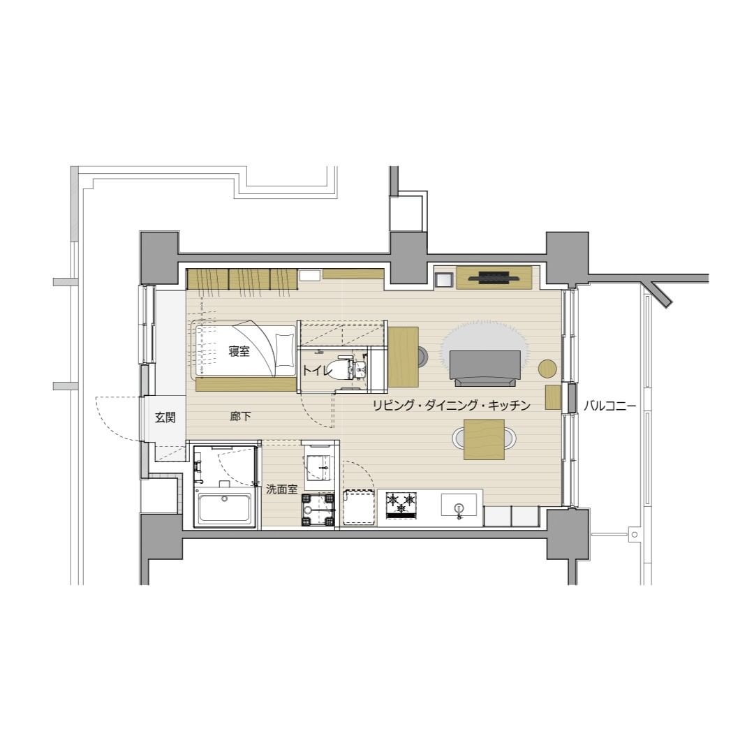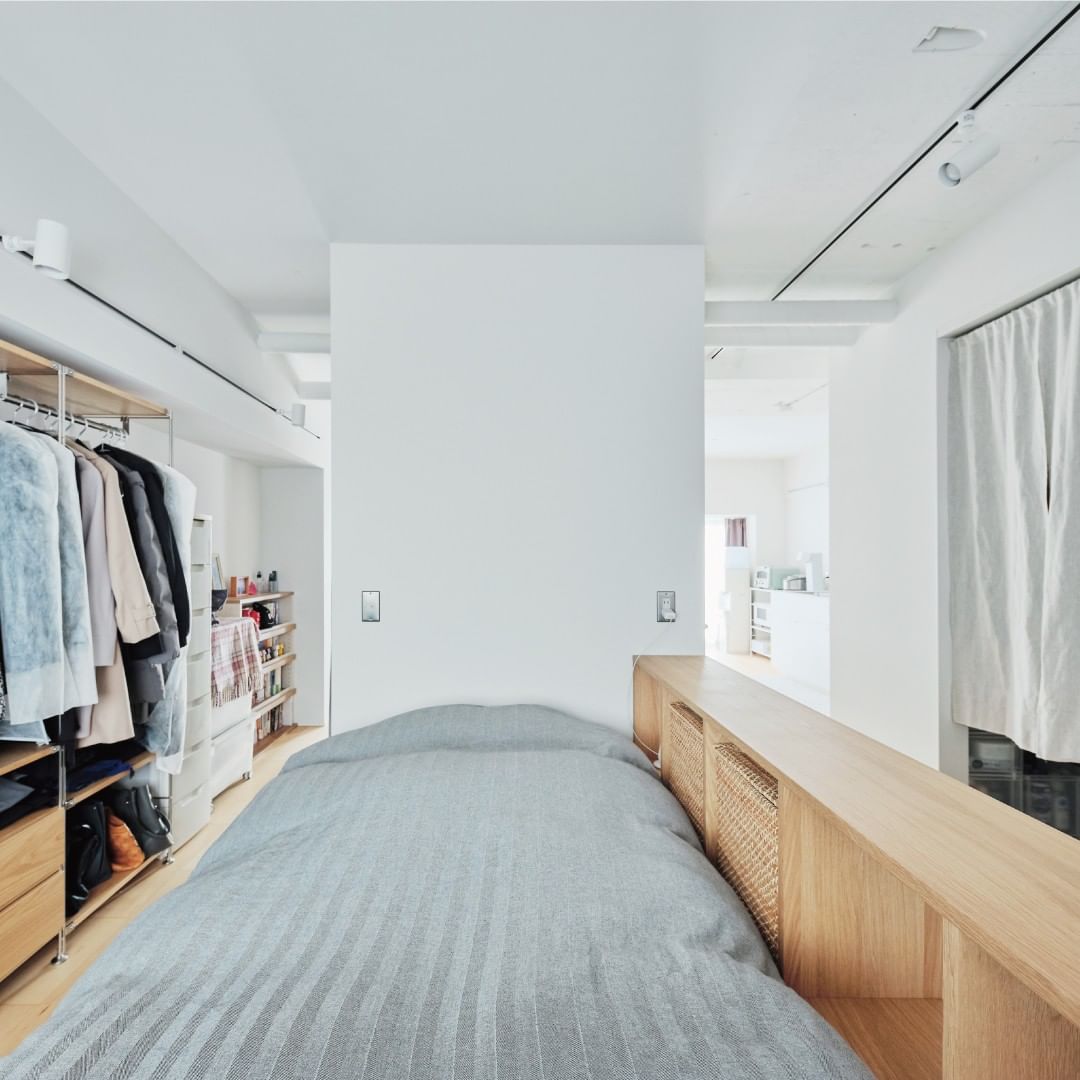 「扉をなくしたことで、移動にストレスを感じずに過ごせますし、どこにいても室内全体に目が通せるような開放感があります。圧迫感を出さないように、洗面所にもドアを付けませんでしたが、のれんをつけるだけで快適に使えていますね。予想以上によかったのは、寝室に、玄関とリビング両方から入れるようにしたこと。住まい全体の風通しも良くなりました。柱の位置の関係で、もともとはデッドスペースとなっていたところも、収納としてうまく活用することができたと思います」