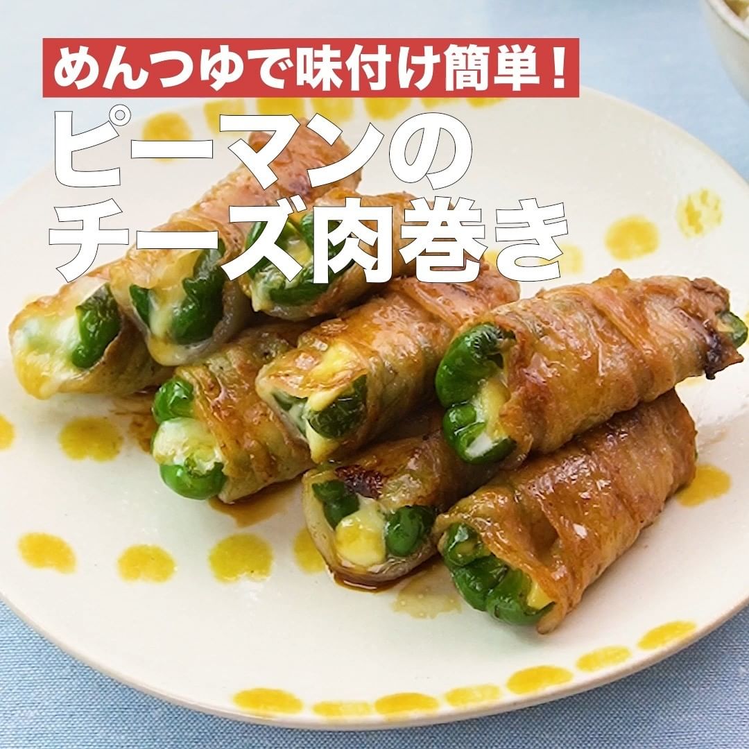 ①<めんつゆで味付け簡単!ピーマンのチーズ肉巻き>