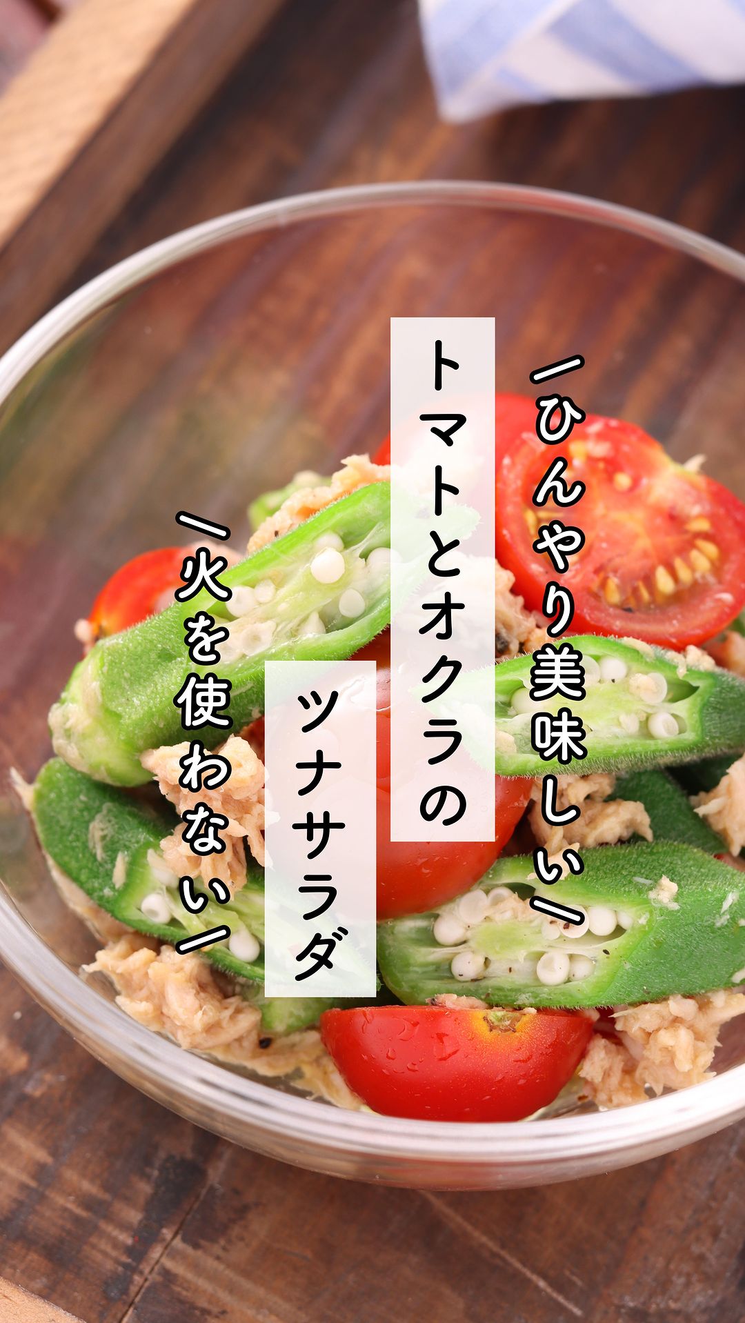 ➊オクラはフォークで数カ所穴を開け、耐熱容器に入れてふんわりラップをする。電子レンジ𝟼𝟶𝟶𝚠で𝟷分𝟹𝟶秒ほど加熱し、斜め切りにする。ミニトマトは半分に切る。