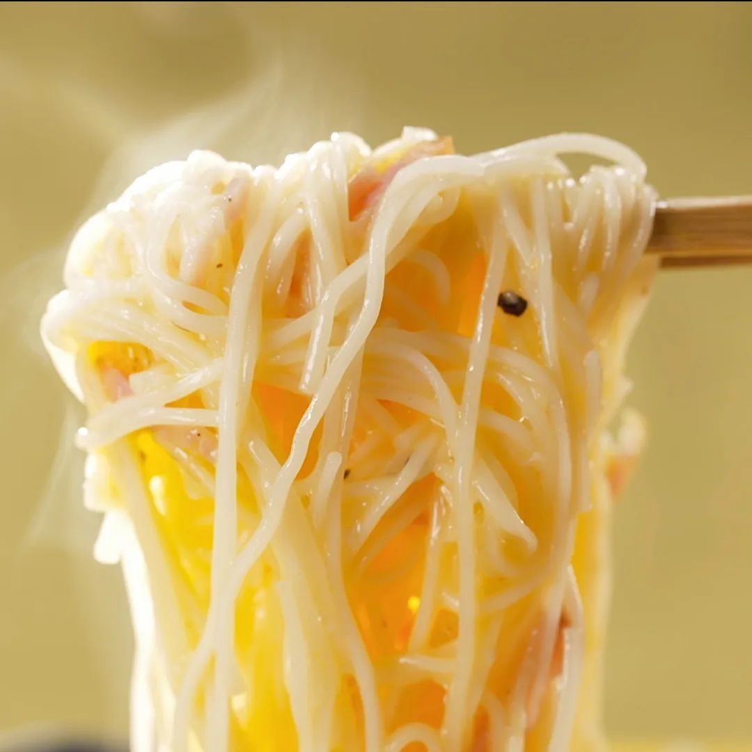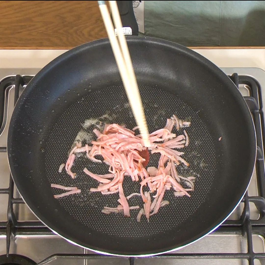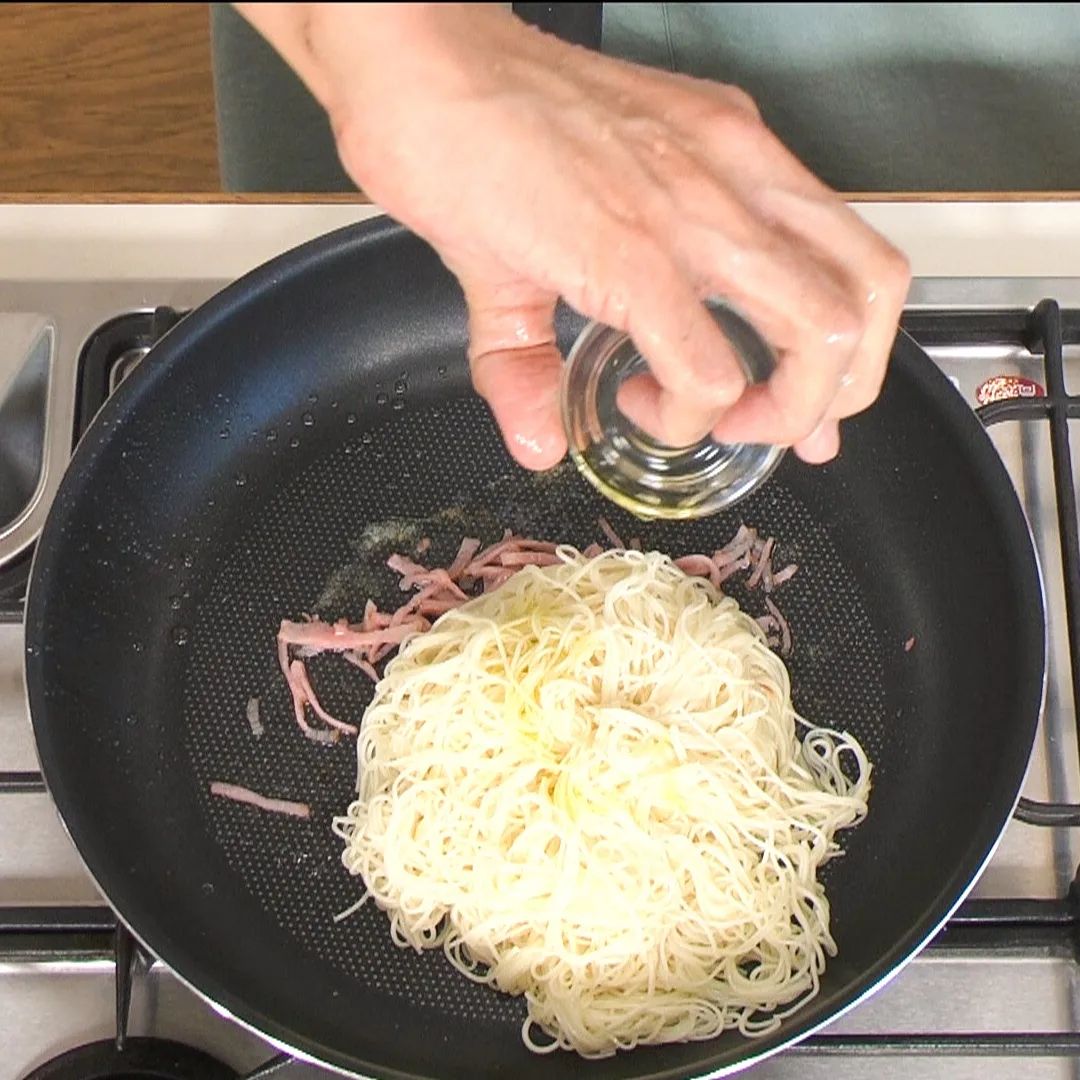 ⑨フライパンに、水気を少し切ったそうめんを入れたら、白だし小さじ 2・1/2、オリーブオイル小さじ 1 を加え、火にかけながらよく混ぜる