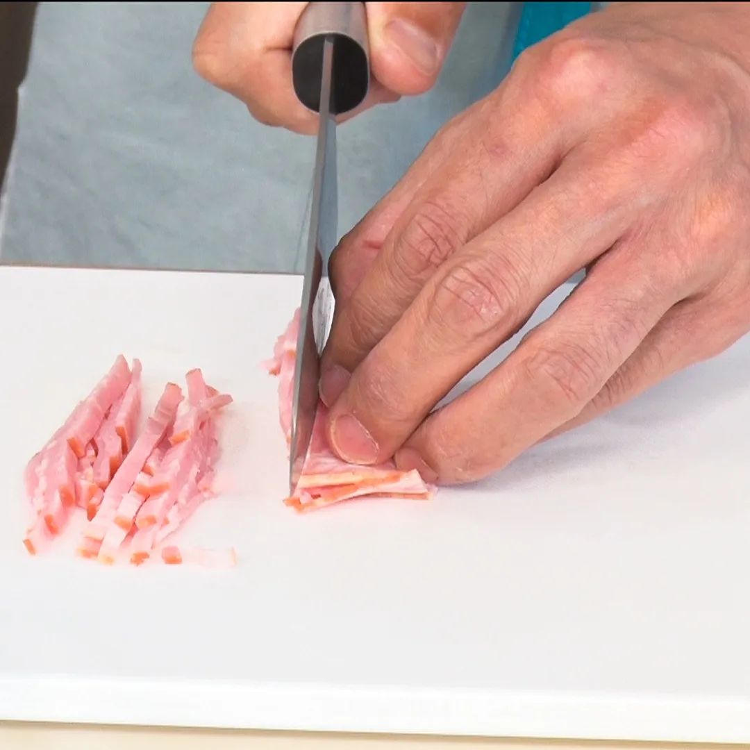 ⑥フライパンにバター10g を入れ、ベーコンを加え炒める