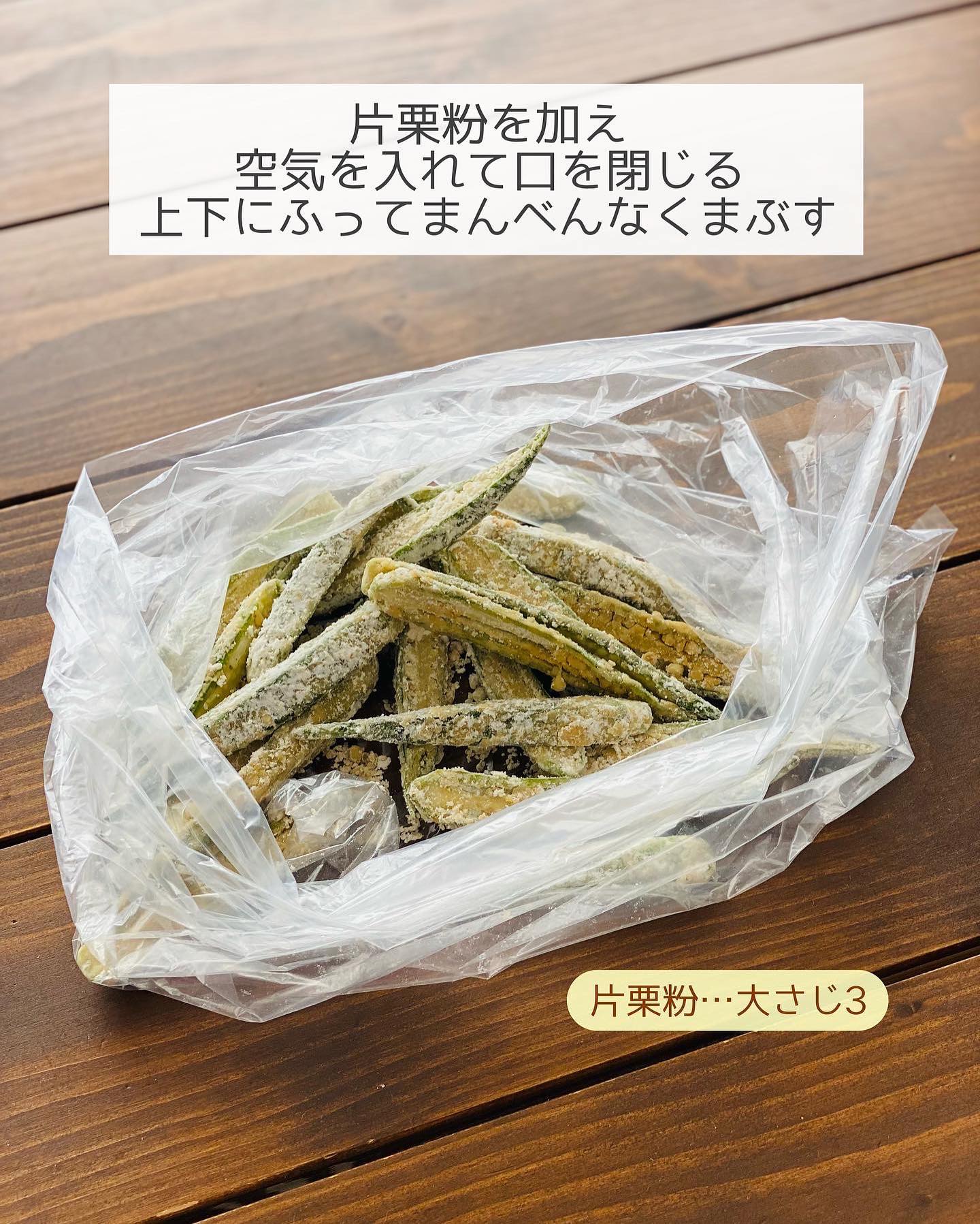 ➌𝟸の袋に片栗粉を加え、空気を入れて口を閉じる。上下にふってまんべんなくまぶす。