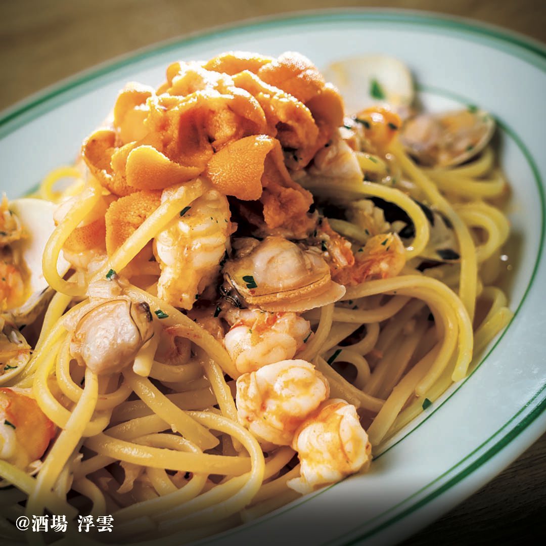 写真④「塩水うにのスパゲッティ」は、金目鯛とのどぐろの頭でとった魚介だしを効かせたペスカトーレに、うにをたっぷりトッピング。