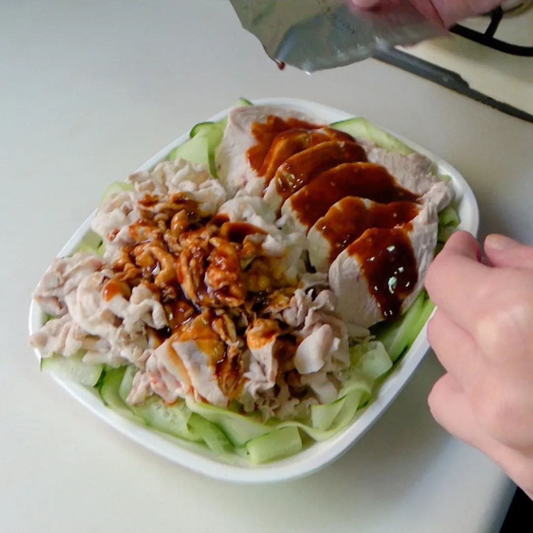 ④ よだれ鶏のたれ1袋をかけ、お好みで刻みネギを散らして完成!