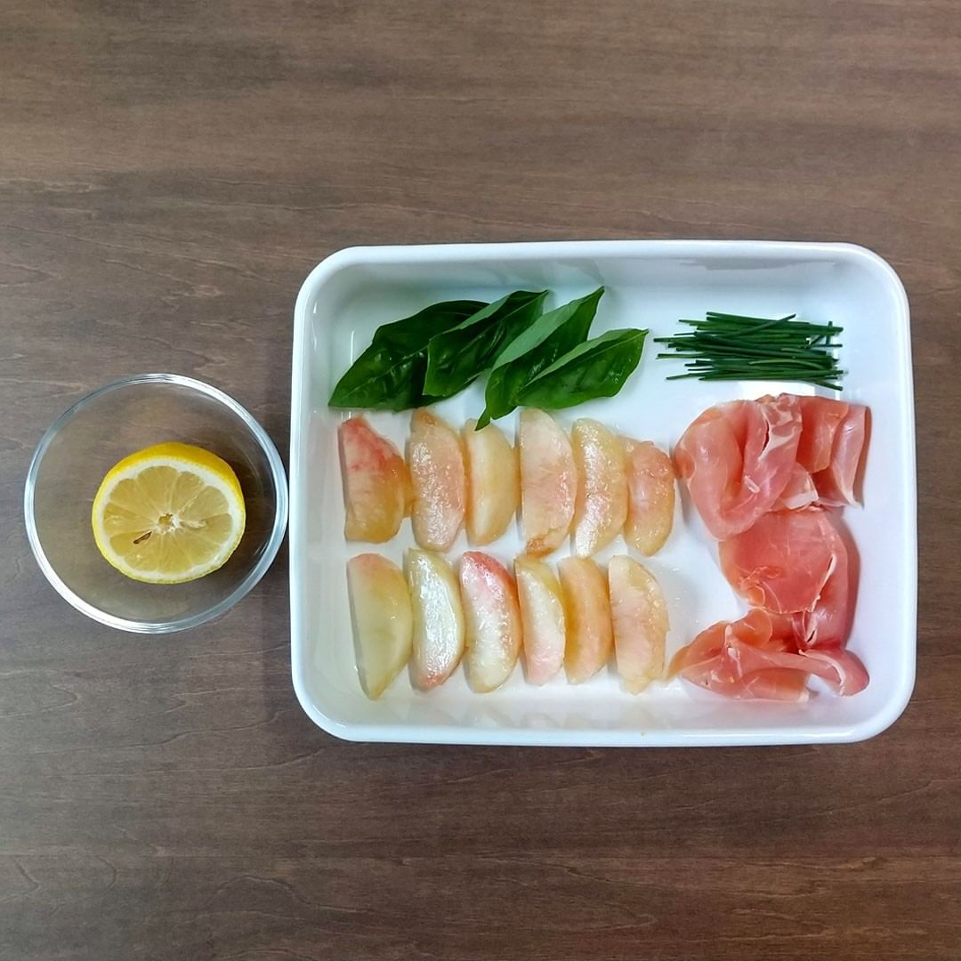 1. 桃の皮をむき、1~2cmのくし形に切る。塩、オリーブオイル、レモン汁をかけて桃のマリネをつくり、冷蔵庫で冷やす。