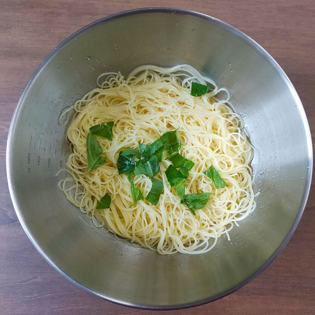 2. 鍋にたっぷりの湯を沸かし1%の塩を加え、カッペリーニをアルデンテに茹でる(表示時間より50秒程度短く茹で、中心に芯を残す)。茹で上がったら氷水に取り、ザルにあげて水気をしっかり取る。