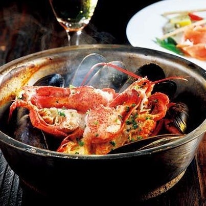 恵比寿のイタリアン『アニマリベラ』のアクアパッツァ。生きたオマール海老を丸ごと使用し、一尾で2名分という贅沢なボリューム。スープは最後リゾットとして堪能できる。