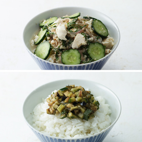 3.ボウルに(1)、きゅうり、オクラ、みょうが、大葉、がごめ昆布を入れ、(2)を加えて全体をよく混ぜ合わせる。冷蔵庫に入れて1時間ほど冷やす。