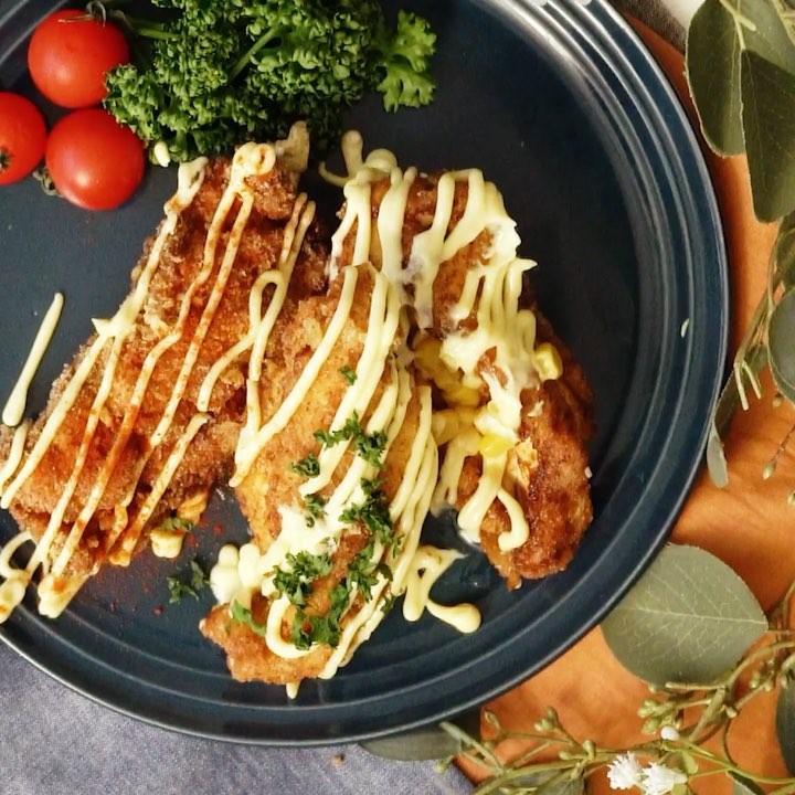 2. 鶏胸肉を3枚開き、それぞれに明太子、コーンマヨネーズ、チーズをのせ包む。⠀