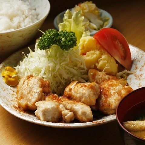 『とんかつ 竹乃』の「鶏生姜焼き定食」。さっぱりした鶏肉と爽やかな生姜ダレで箸が止まらないレベルだ!