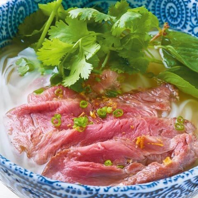 『スガハラ フォー』の「牛肉のフォー」は、透きとおったスープが美しい。薬味はパクチーとスイートバジル、お好みでライムを。