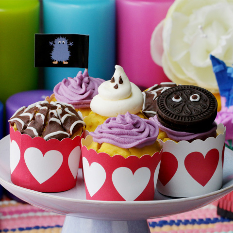 9. おばけカップケーキを作る。(5)にバタークリームをうず巻き状に絞り、チョコペンでおばけの顔を描く。