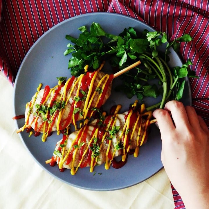 6. 焼きあがったらケチャップとマスタードをかけて召し上がれ!⠀