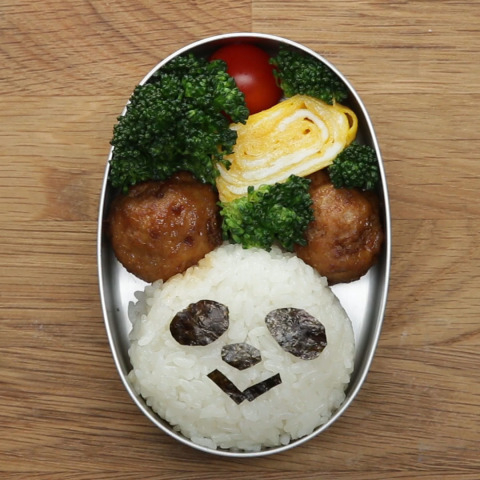 4.パンダおにぎりを作る。手に水と塩をつけ、ご飯の真ん中に(3)のミートボールを入れ、丸く握る。おにぎりを弁当箱の中に入れ、パンダの耳に当たる部分にミートボールを入れる。海苔をパンダの顔になるように切り抜いて貼り付け、お好みのお弁当のおかずを詰めたら、完成!