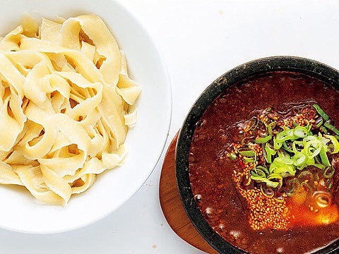激辛ファンにも一目置かれる『味覚』の名物は、黒い石鍋に入った「頂天石焼 麻婆刀削麺」。 まずは薄辛から始め、少しずつ辛さのランクを上げていくのが正しい作法。