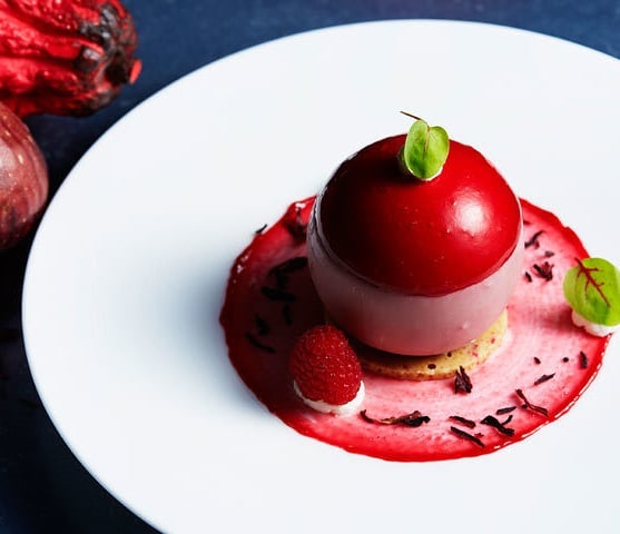 『ピエール・ガニェール』の女性限定特別ランチコース「ピンクレディースランチ」では、デザート「スフィア・ルビー」を楽しめる。ルビーカカオと呼ばれる厳選されたカカオ豆から生まれた「ルビーチョコレート」を使用した、見た目も美しく女性心をくすぐるデザートだ。