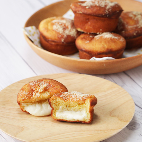 4.マフィン型に溶かしバター(分量外)を塗り、1/3の高さまで(3)を等分に流し入れ、さけるチーズを入れる。上から(3)を等分に流し入れ、粉チーズを振りかける。