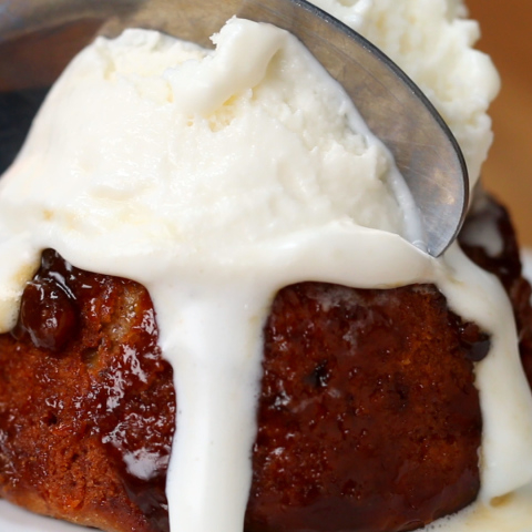 6. 180℃のオーブンで20-25分焼く。竹串をさして何もついてこなければ型から取り出す。皿にのせて、バニラアイスを添えたら、完成!