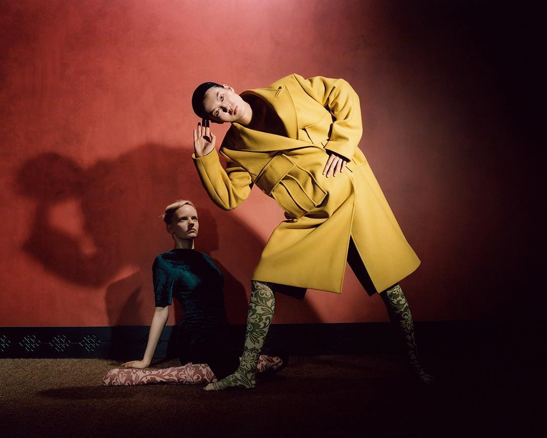 Two characters embody the duality of this season’s influences with KENZO’s new draped velvet dress and belted coat.