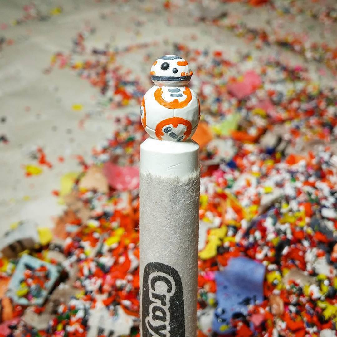 アメリカ・ペンシルベニア州ピッツバーグ在住のHoang Tran (@mumblestohimself) さんは30歳になってもクレヨン遊びが大好きだという。といっても、クレヨンで塗り絵をするわけではなく、クレヨンそのものにキャラクターの精密な彫刻を施す遊びだ。これは歯学部の学生だった頃に身についたちょっとした特技。「もっとクリエイティブなことがしたくて、歯科医への道はあきらめました。その何年か前に見た誰かのクレヨン彫刻が気になって、歯学部でもロウを彫って歯型を作るといったようなことをやっていたので、自分にもできると思って挑戦しました」現在はHollenbackというステンレス製の歯科器具を用いて、ダース・ベイダーからスポンジ・ボブ、ザ・シンプソンズの登場人物に至るまで、あらゆるキャラクターのフィギュアをクレヨンに彫る。巻き紙をはがし、彫刻をほどこし、溶かしたロウを継ぎ足して、最後に細かく色を加える。「自分はこの作業が心の底から好きだということがわかりました。今は作品をオンラインで販売したり、ギャラリーで展示をしたりするだけでなく、注文制作も手がけています。クレヨンは、誰でも楽しめるものなのでしょう」