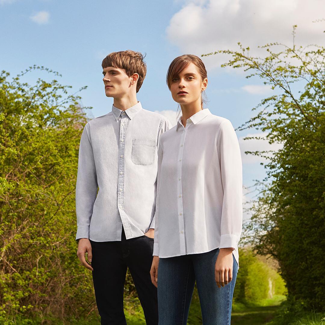@UNIQLO ユニクロ: Side-by-side in a simple white shirt with a classic pair of jeans.