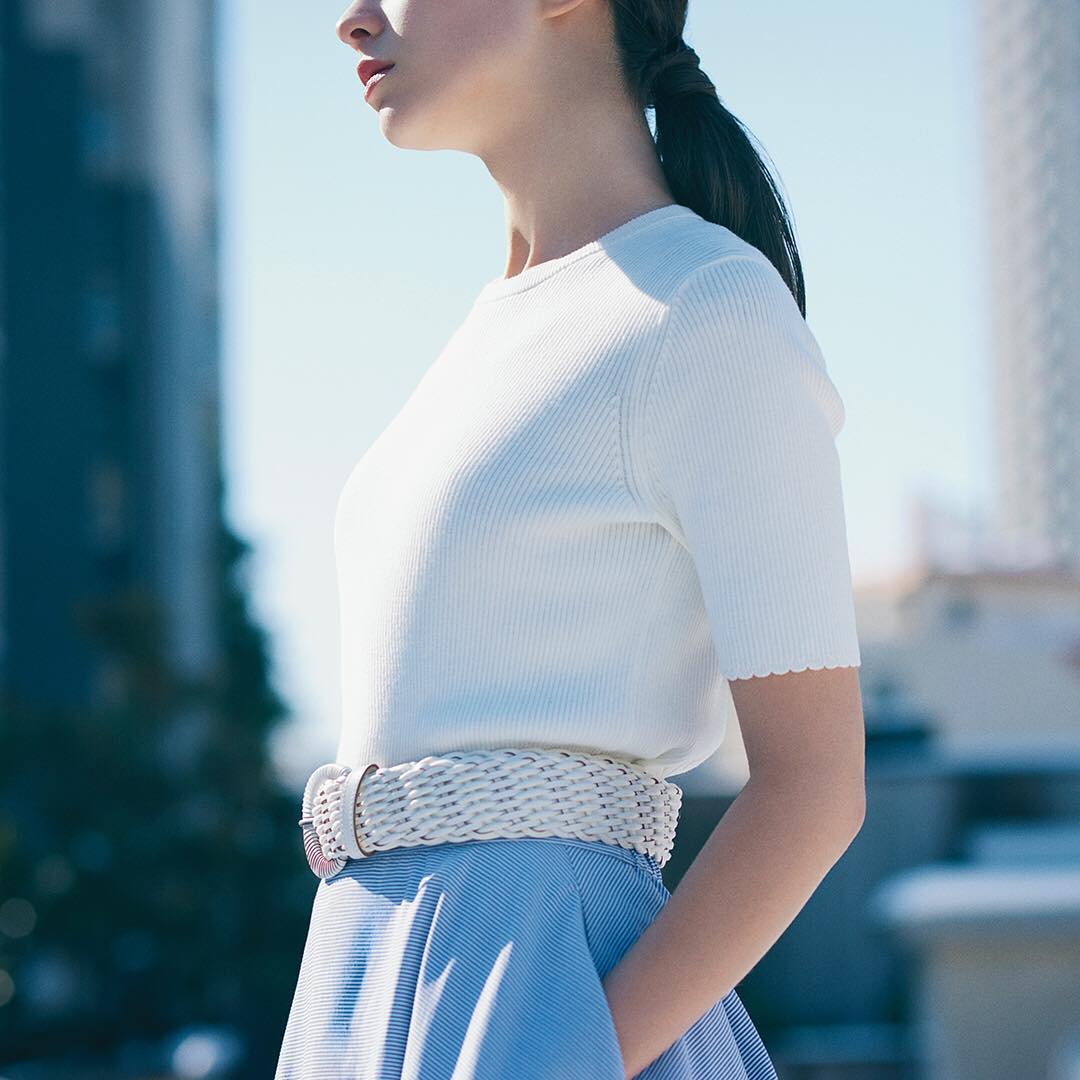 Embracing warm days in simple, refined comfort. #UVCutRibbedSweater #CircularSkirt #WideMeshBelt #UniqloLifeWear #LifeWear