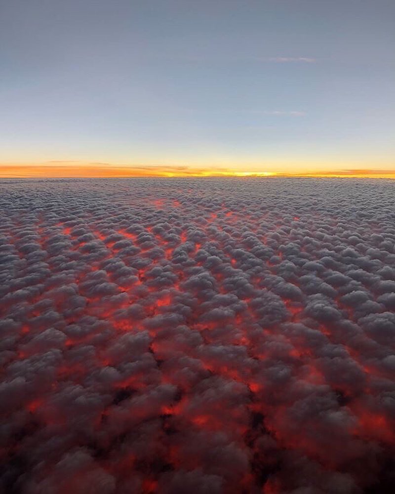 This is so incredible. The setting sun lights up the clouds from below and creates this otherworldly scene. What a capture!! One reason why not to sleep on a flight!