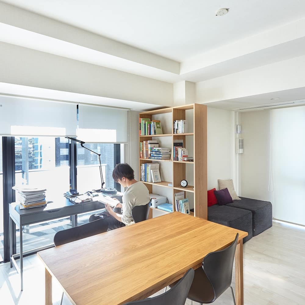 参考書などの書籍が多くあるため、テーブルと同じオーク材のスタッキングシェルフを本棚に。本などの収納としてだけでなく、リビングスペースとの間仕切りの役目も兼ねています。こちらも追加セットで収納を増やしたり、横倒しにしたり、生活が変わったときに組み替えて、また違った収納として、永くご使用いただけます。