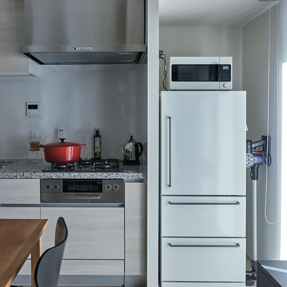 「子どもの頃から、柄モノが苦手で、無印良品の洋服を好んで着ていました」というお客さま。東京でのひとり暮らしのため、MUJI SUPPORTにご参加いただきました。家具に限らず、「ながくつかえる物」でそろえるようにしているとお聞きしたので、お食事や勉強で使用するテーブルは、使いこむことにより素材の味わいが増す無垢材のテーブルで選んでいただきました。