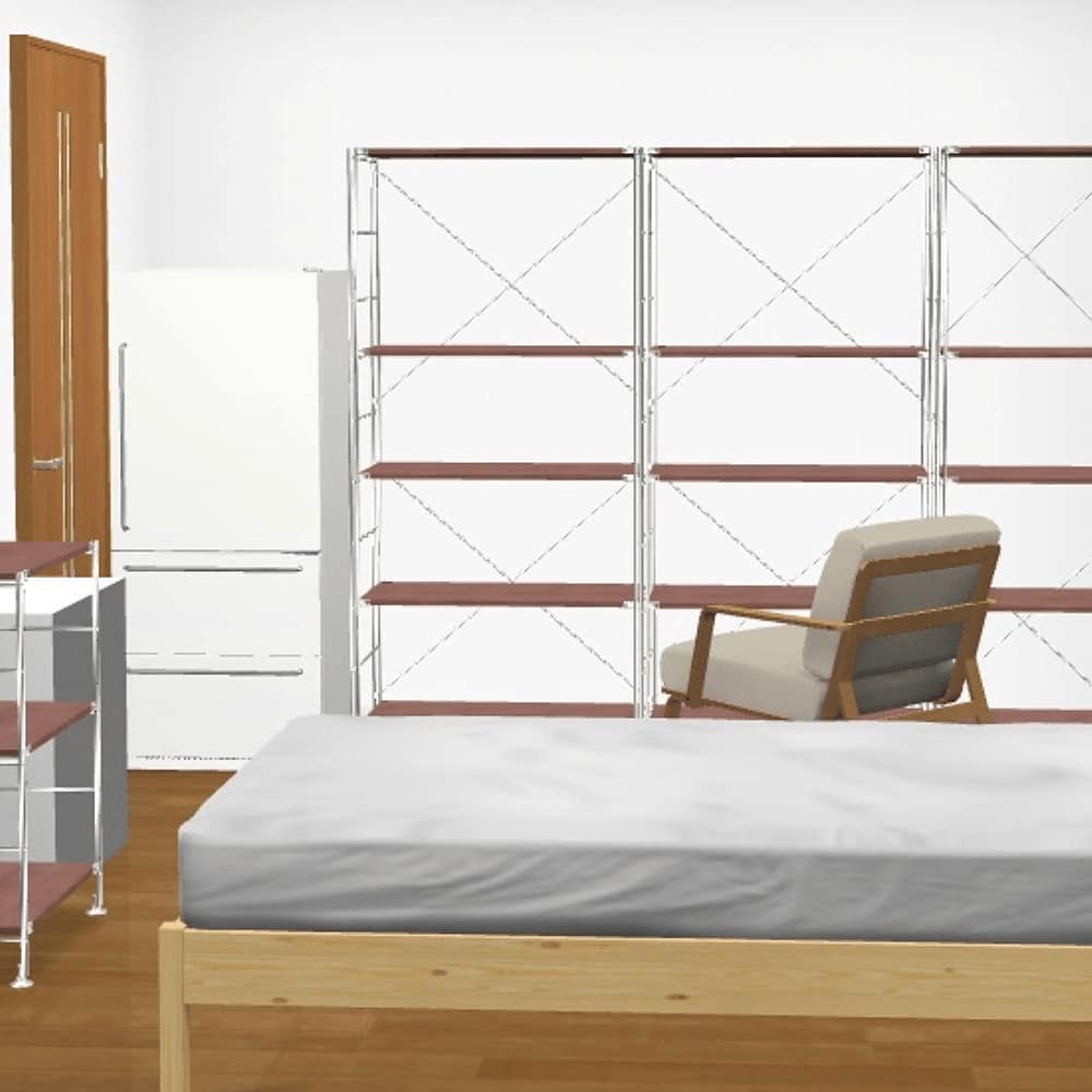 無印良品のパイン材のベッドをお持ちとの事で、引越を機に机やワードローブ、収納棚などを探しにご来店されました。はじめはパイン材で揃えることを検討していらっしゃいましたが、パーツが豊富なステンレスユニットシェルフなら、壁面にワードローブ・収納棚・デスクをまとめて収める事ができ、ワンルームでもすっきりした印象のお部屋に。椅子をソファチェアにすることでチェアとしても、くつろぐソファとしても兼用して使えます。