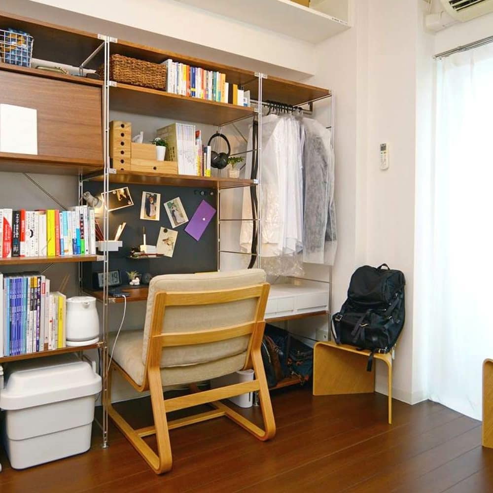 デスク、ワードローブ、棚が欲しいとのご相談を受け、ユニットシェルフを活用したコーディネートをご提案。連結できて奥行が揃ったユニットシェルフだからこそ、限られた空間に、機能的に3つのご希望を叶えることができます。「部屋がより広く、使いやすいレイアウトになりました。何をどこに置くか、ということが明確になったので、片付けが楽しくなりました。」と、おっしゃっていただきました。