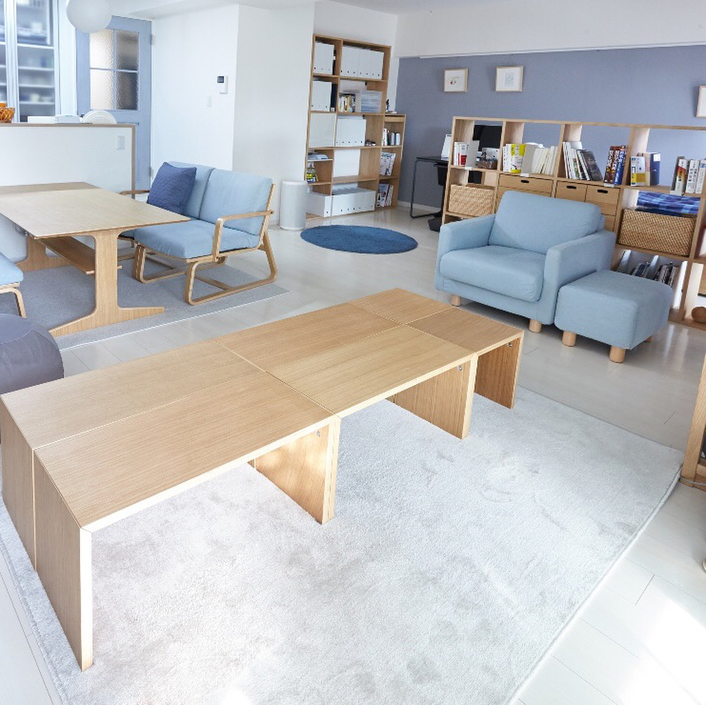 マンションのリノベーションをきっかけに、新しい生活を無印良品の家具でスタートしたいとご相談いただきました。「この家具を使いたいけどどういった雰囲気になるのだろうか」というお客さまに、3Dシミュレーターを用いながら配置や色の選び方のお手伝いをいたしました。こだわったのは「ブルーを活かすこと」と「人の集まりやすさ」。スモーキーブルーのドアや壁を毎日楽しめるような、ラグやカーテンの色を選び、コの字の家具を用いて、どんな人数でもフレキシブルに対応できるようなリビングを作り上げました。