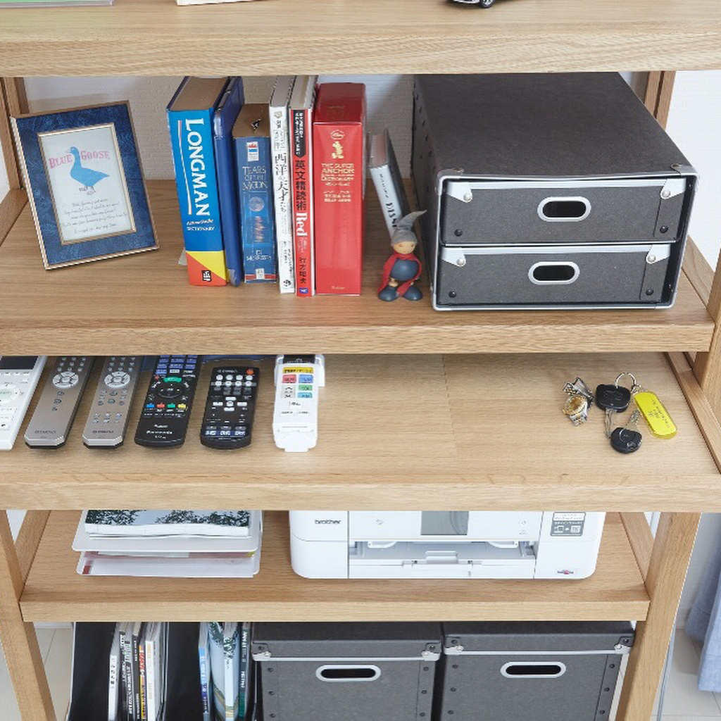 LDKの出入り口となる落ち着いた佇まいの青色のドアに合わせ、お部屋の各所に青色を取り入れたファブリックスやインテリアを設置。収納は、「組み合わせて使える木製収納」や「シェルフ」を組み合わせて、すっきりだけど大容量の収納を実現しました。