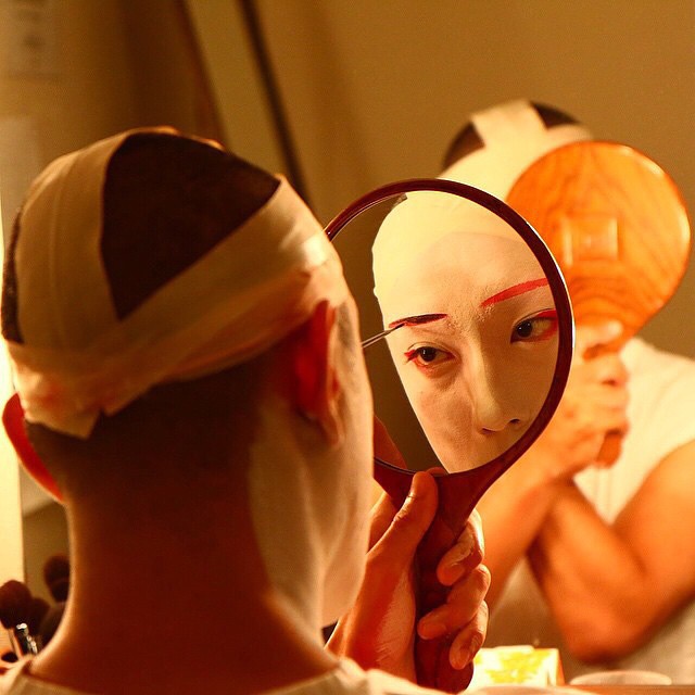 舞台直前の控室。市川海老蔵 (@ebizoichikawa.ebizoichikawa) さんは、いつもの様に鏡に向かって自らの顔に化粧を施す。「歌舞伎役者は、顔を全て自分で作っています」と話す海老蔵さん。歌舞伎の世界では、化粧は役に入り込んでいくための準備として、よく“顔を作る”という言い方をするそうだ。独特な化粧文化を作り上げてきた歌舞伎には、役柄を表現するために用いられる技法が幾つかあり、その代表的な手法に隈取りというものがある。隈取りは、顔の血管や筋を強調するために描かれるようになったとされ、その役の勇ましさや強さなどを引き出すものなのだと言う。「赤色は正義、藍色は悪、茶色は妖怪など、役柄によって使う色は違ってきます」と彼は説明する。歌舞伎役者にとって、こうした化粧を覚えることも大切な仕事の一つ。「子供の頃は、化粧に2時間半もかかっていましたが、経験を積み重ねる度にコツを掴み、今では平均15分くらいで仕上げています。早拵え(はやごしらえ)という、5分ほどで支度をしなければならない場面もあるのですが、これがなかなかハードなんです。」化粧にこめられた芸術性を写真や動画で伝えることの意味について、海老蔵さんは冗談交じりに語る。「歌舞伎の化粧のことを世界の人に知ってもらえるのは嬉しいですし、一人の男が鬼にも女性にも変わることができるすごいものなので、是非やってみてください!」