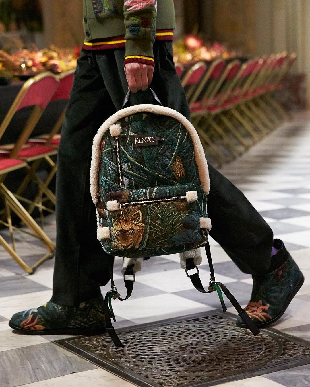 Yesterday at the KENZO – La Collection Memento 3 runway show: a tapestry jacquard backpack with shearling trims inspired by « The Dream » from painter Henri Rousseau. #Kenzo #CollectionMemento3