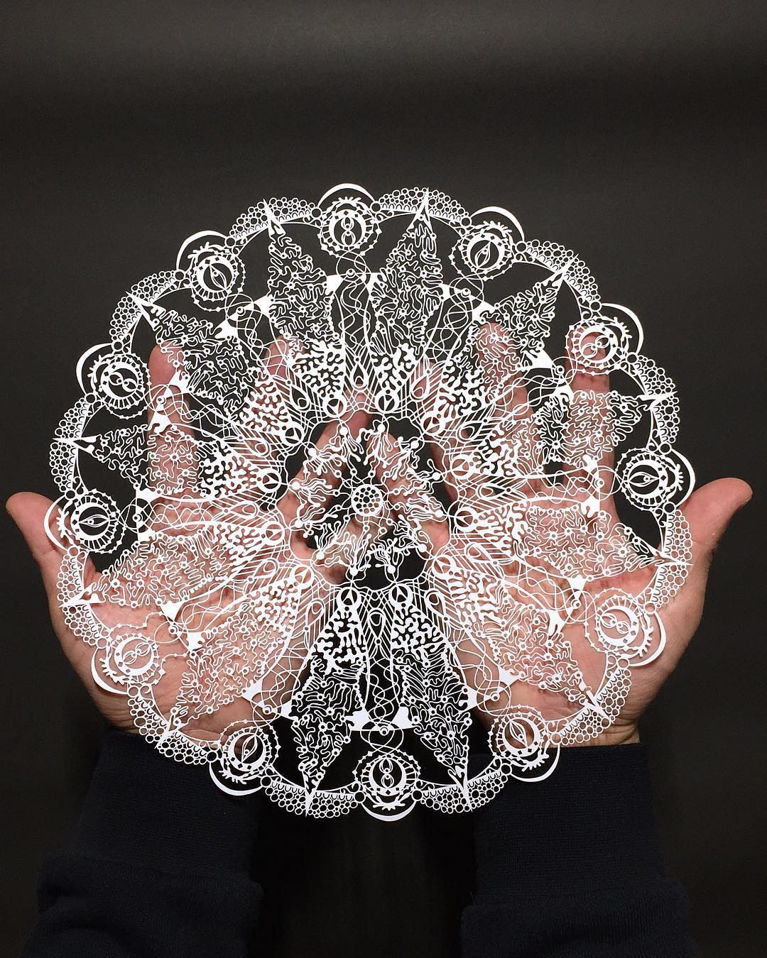 Photo by @mr_riu 「白黒での表現にはこだわっています。色を使わず、造形、デザインに重きを置いています。それと、繋がった一枚の紙で完成させること」独学で学んだ切り絵作品をシェアしているRIU (@mr_riu) さん。白と黒の紙だけを用い、曼荼羅模様など複雑な図柄の作品を編み出している。「切り絵の魅力は1枚の紙が切り抜かれて、残った紙やくり抜かれた紙で作品が出来上がる。私の作風の場合は他の色紙も使わない、着色もしない、接着剤も使わない、その単純さと潔さかなと思います」作品によっては完成まで30時間以上も費やされる切り絵制作。集中力が必要なためかなり疲れるものの、その疲労感も集中した人だけが得られる魅力的な達成感だという。「誰かの生きる活力みたいなものの手助けが出来れば本望です。家に飾ってあるだけで力が出る、みたいな。まだその域には達していませんが」