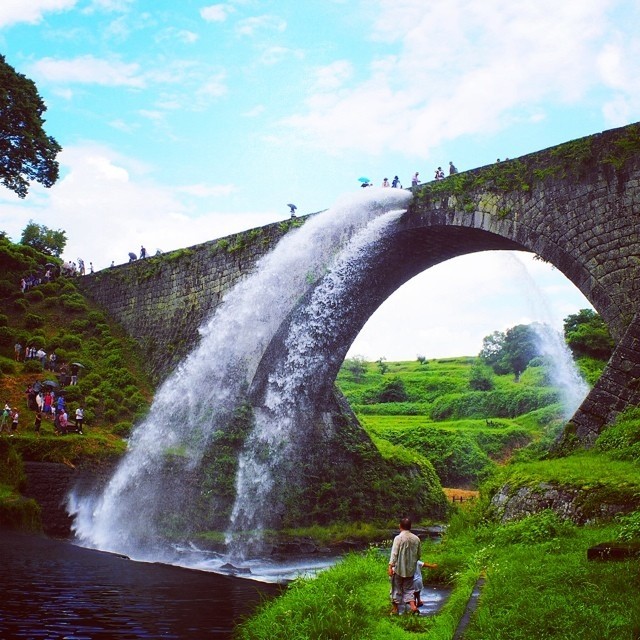 熊本県上益城郡山都町にある通潤橋は、日本最大級の石造りアーチ水路橋。全長75.6メートル、高さ20.2メートルのこの橋は、白糸台地の水不足を解消するために嘉永7年(1854年)に建設され、昭和35年(1960年)には国の重要文化財に指定された。橋の上部には水を放つための通水管があり、石管水路の内部にたまった泥や砂を取り除く役割を果たす。今では主に観光アトラクションとして放水が行われ、その迫力ある風景はInstagramでもシェアされています。