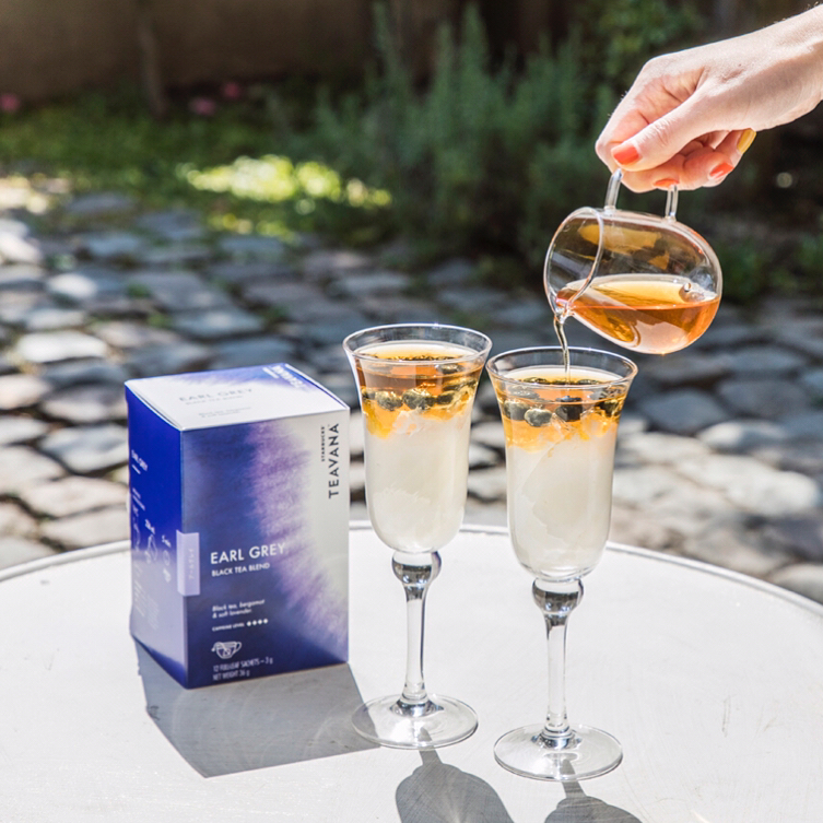 ババロアの上にジャムを乗せてから、アールグレイを注いで、ブルーベリーを浮かべて。お好みのティーやフルーツで試してみてくださいね😘