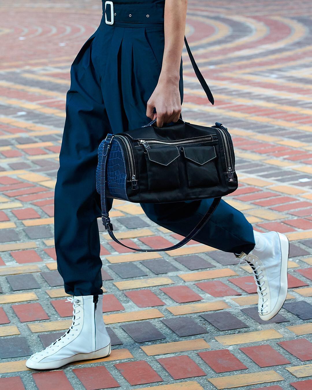 Close up from look 13 of #KENZOSS18 Men’s runway collection featuring high waisted pants accessorized with a dark blue micro gym bag in nylon and leather and white flat soled boots.