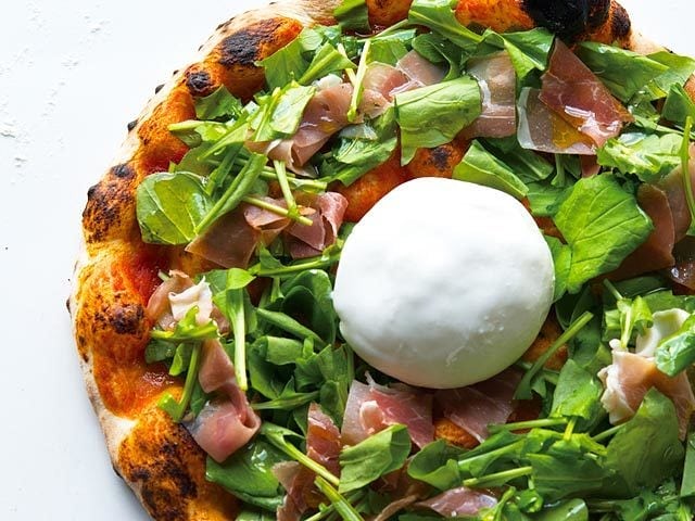 東京ミッドタウン日比谷の『GOOD CHEESE GOOD PIZZA』。「マルゲリータ・ブラータ」は、生地を先に焼き上げ、できたてのブラータ、フレッシュなルッコラ、生ハムを後からトッピングするため、熱々の生地とフレッシュな素材を楽しめる一品だ。