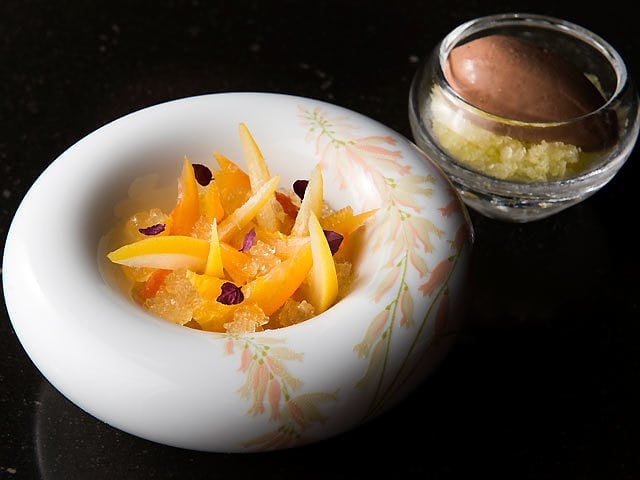 『ル・ショコラ・アラン・デュカス 六本木』の「クープ・ダグリューム/ソルベ・ショコラ」は、夏季限定のスペシャルデセール。オレンジのマーマレードや柑橘のジュレ、甘夏・グレープフルーツ・レモンのコンフィ、デコポン・オレンジの果肉など、さわやかな柑橘系果実の上に赤紫蘇を散りばめている。また、ほろ苦く甘酸っぱい柑橘のグラニテは、ソルベ・ショコラの奥深いカカオのくちどけと絶妙にマッチ!