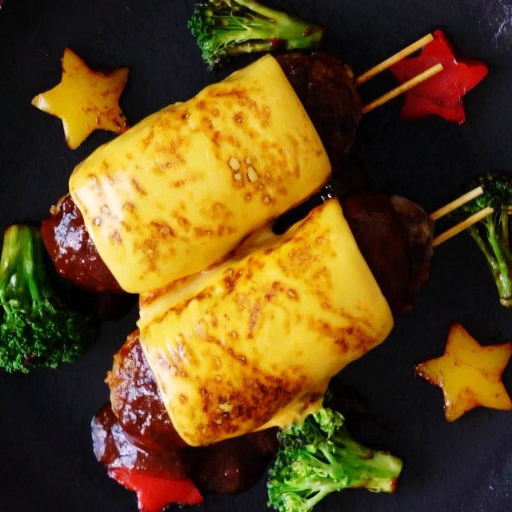 3. 形成したらフライパンにのせ、表面を焼き、デミグラスソース、小房に切ったブロッコリーと星形にくり抜いたパプリカをのせ、蓋を閉める。中火で10分弱加熱する。⠀⠀