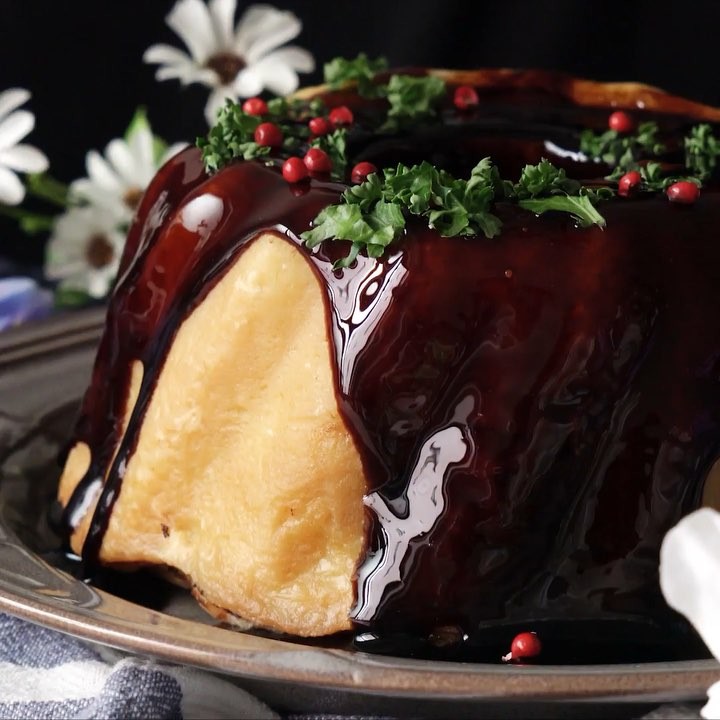 6. 4で焼いた生地をクグロフ型から出して、皿に盛り付けてバルサミコソースを上からかける。⠀