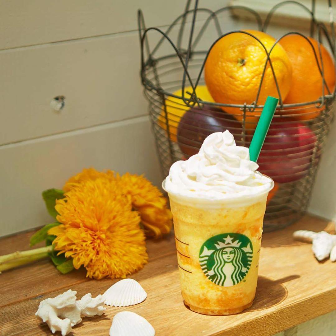 3種類の #オレンジ を贅沢に使った #クラッシュオレンジフラペチーノ が本日から新登場🍊