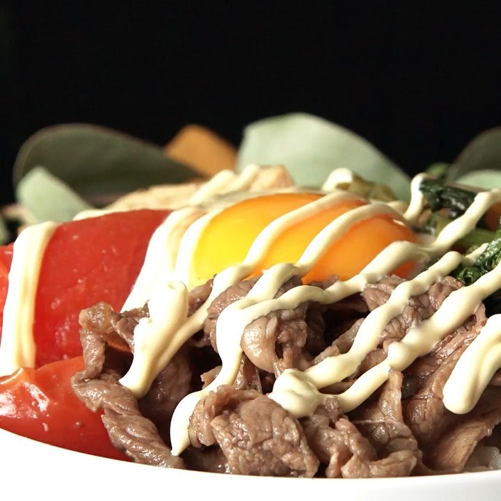 4. どんぶりにご飯をよそい、3をのせ、加熱したチーズ、卵黄とマヨネーズをのせる。⠀