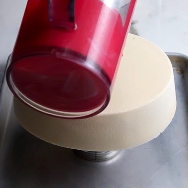 3. 天板の中央に缶を立てて置き、(2)を型から手早く外してのせる。湯煎で32-35℃に温めたミラーグレーズをまわしかけたら、完成!