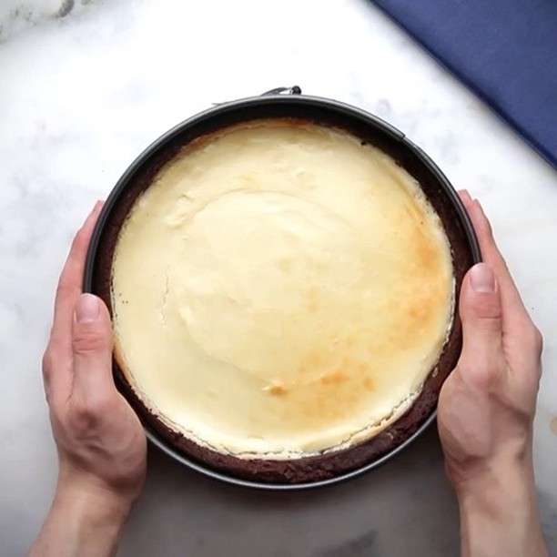 4. 20センチのパンに薄く油を塗り、(5)の上に置く。そのままブラウニーミックスが型の半分ほどの高さになるまで押し、180℃のオーブンで35分焼く。焼き終わったら5分休ませる。