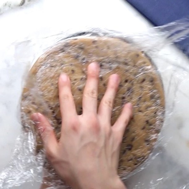 2. 25センチの型に、隙間がないようにラップを2枚被せる。チョコチップクッキー生地をのせてパン全体に行き渡るように広げる。ラップを被せて生地を取り出し、冷凍庫で冷やしておく。